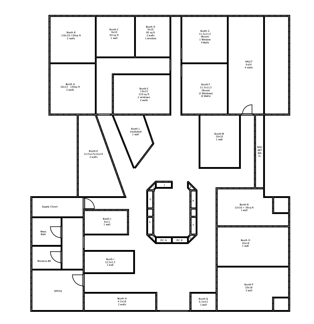 Initially we will have about 20 booths/rooms for artist and antique vendors, expanding to over 100 in the coming months. The map below shows the initial space, and if you keep scrolling you will find the full map with expansion.